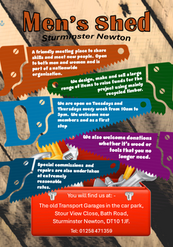 The Men's Stour is a great place to socialise, share and learn skills. We are open Tuesdays, and Thursdays from 10:00am to 3:00pm.